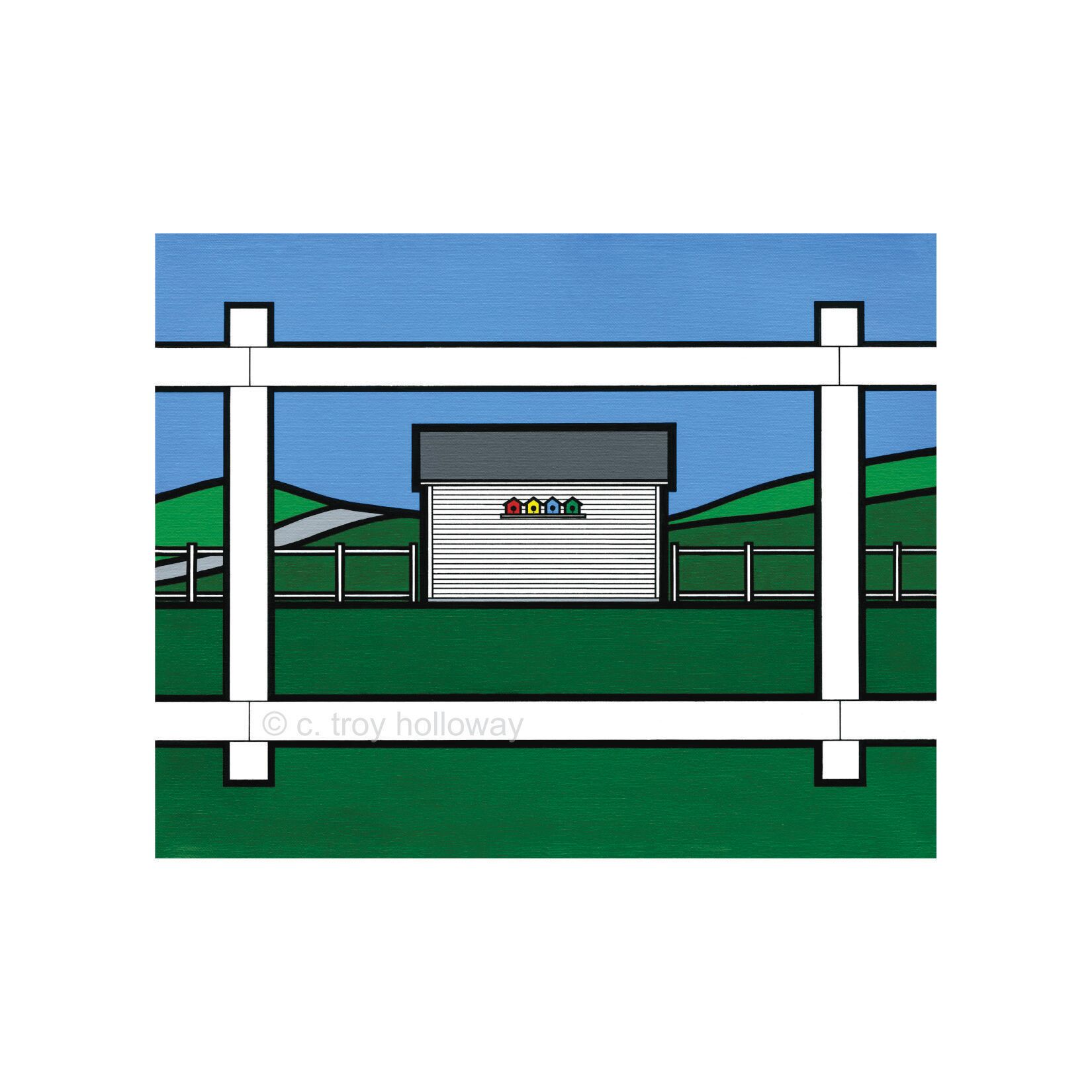 I photographed this neat and tidy shed in Twillingate a few years ago. Normally I'm more interested in decrepit, weather-beaten buildings, but this one caught my eye. The shed, fence, and garden were immaculately cared for, however it was the placement of four brightly painted birdhouses that really drew me in. The white fence frames the view, and the white shed displays the little birdhouses like a gallery wall. This is the first of two A Roof Over Our Heads paintings.