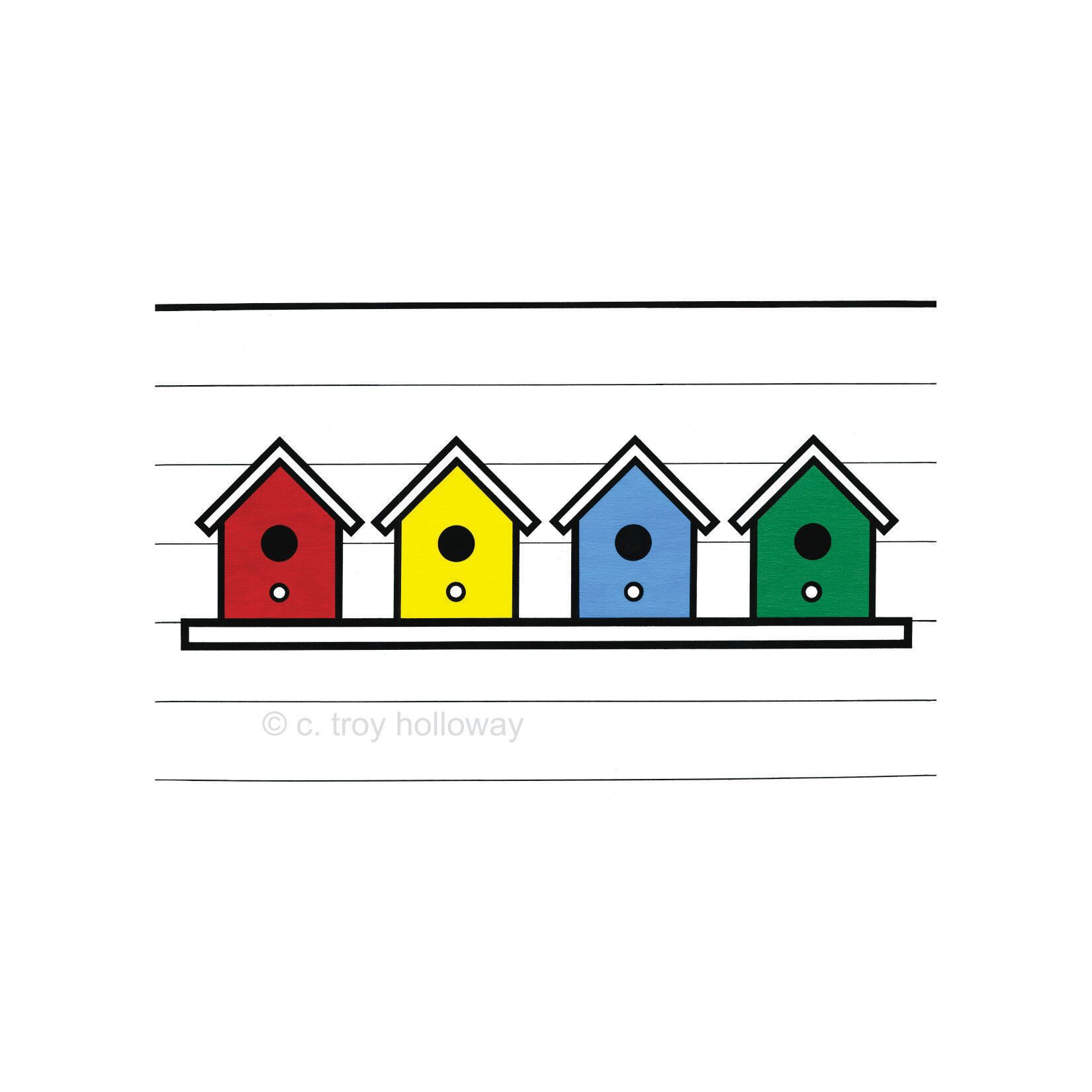 Four bright little birdhouses under the protective eave of a white shed. The second part of A Roof Over Our Heads.